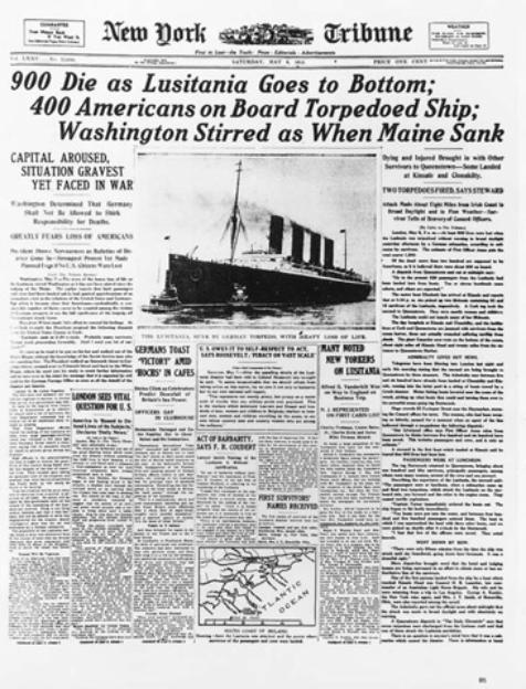 The sinking of the Lusitania shocked Americans and illustrated the complexity and horror of modern warfare. In the days before radio, most Americans received their news through the newspapers. New York had fifteen daily papers in 1915, and all produced "Extra" editions to announce such dramatic events as the sinking of the Lusitania. (New York Tribune, May 8, 1915)