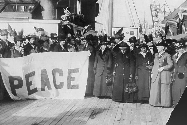Part of the American delegation to the International Congress of Women at The Hague, The Netherlands, April 28-May 1, 1915. The American women braved submarine-infested waters to join women from the neutral countries and from those at war to try to stop the war through mediation. Jane Addams (behind the peace banner facing right) was elected president of the congress. The women were ridiculed by the press on both sides of the Atlantic, but they represented an important part of an idealistic American peace movement. (The Swarthmore College Peace Collection)
